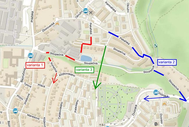 Varianta 1: Pod Zborovce z kopce dolů ke stavebninám, prudkým stoupáním chodníčkem k ulici Konečná, následně ulice Křižkovského a dále. Tento chodník je v zimě téměř neschůdný, klouže.