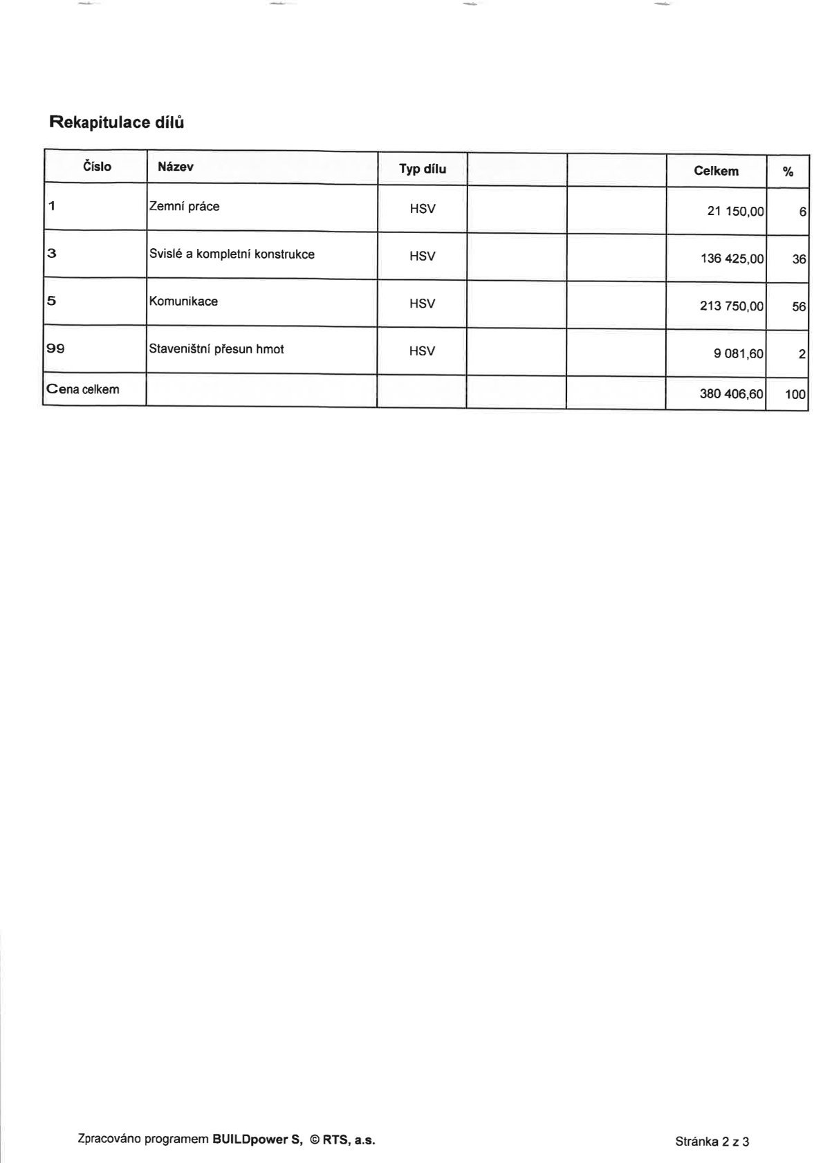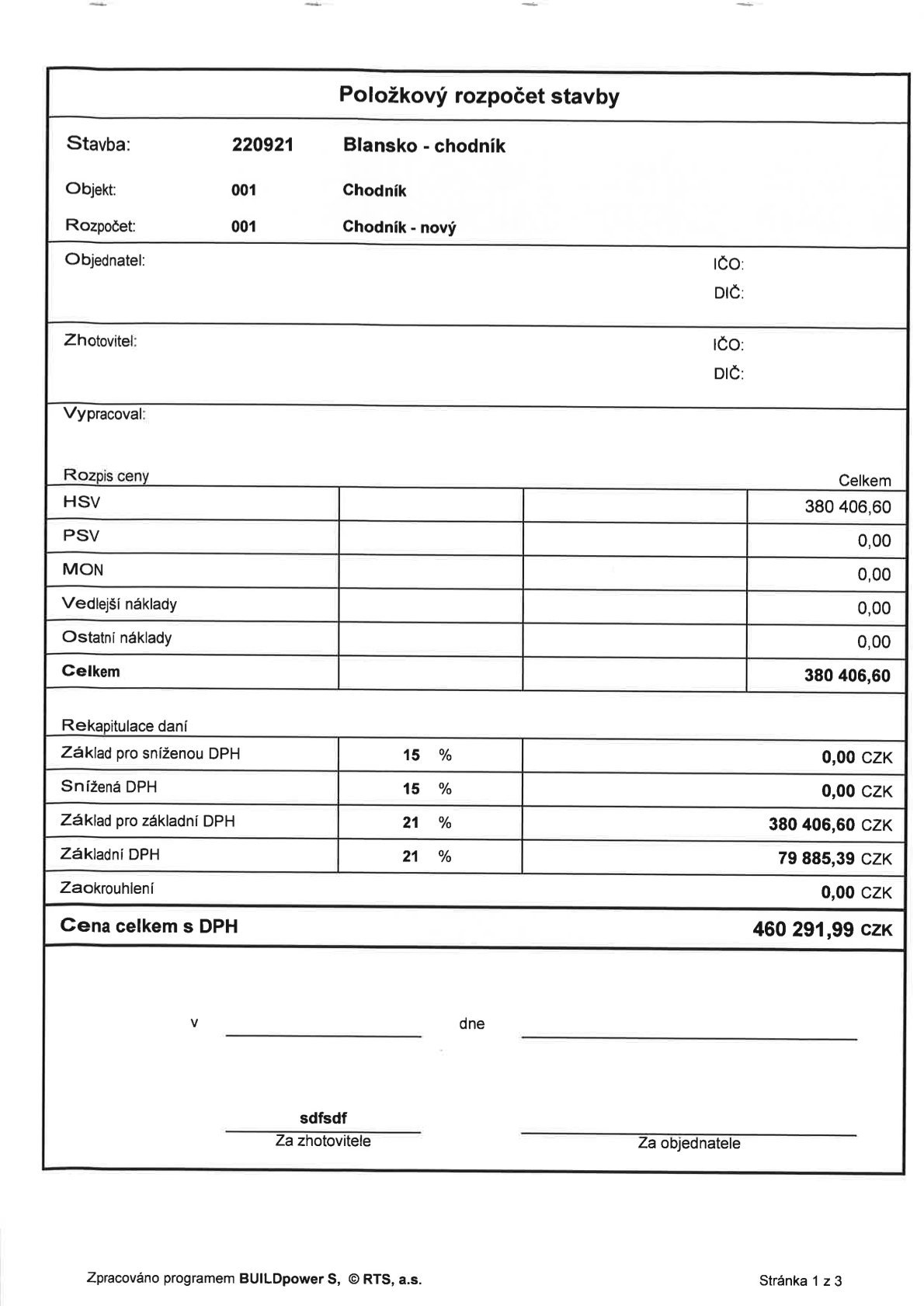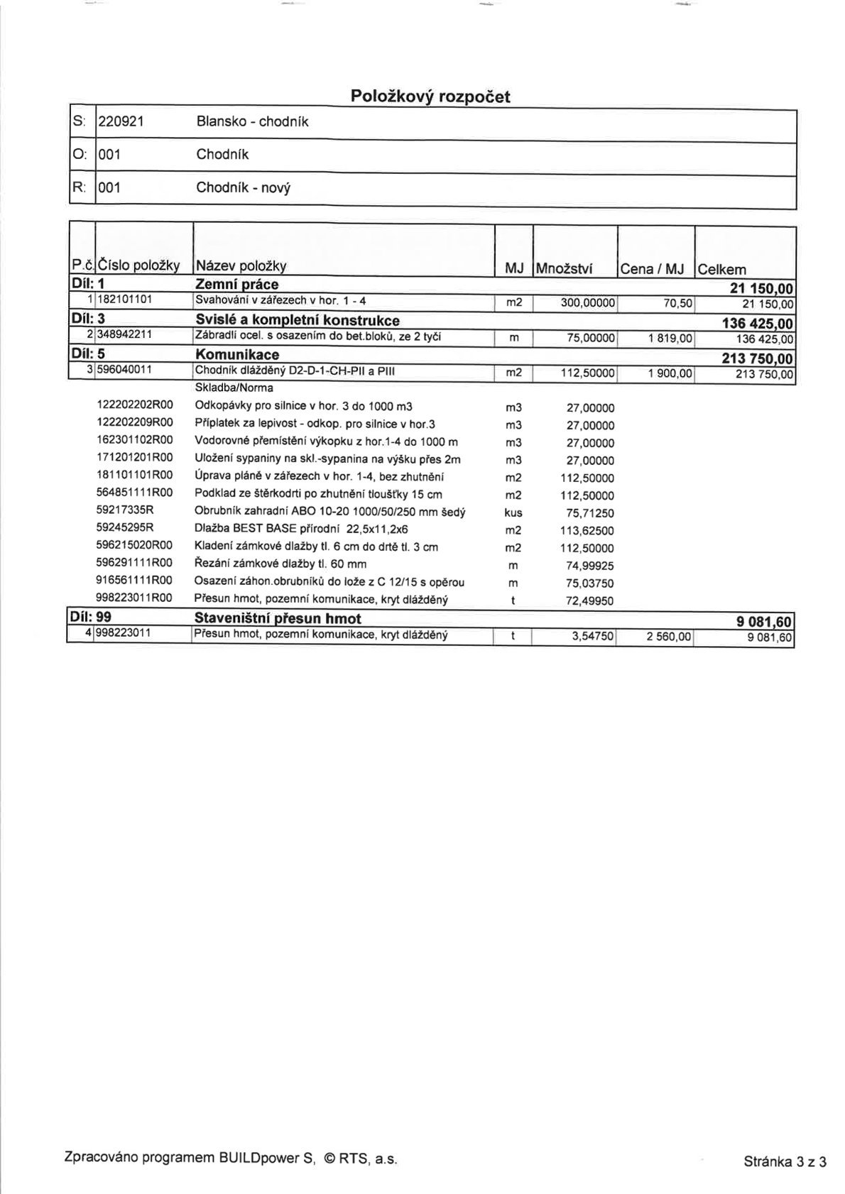 Cca 460 tisíc Kč s DPH. Vzhledem k tomu, že není k dispozici přesné geodetické zaměření lokality, jednalo se o kvalifikovaný odhad.