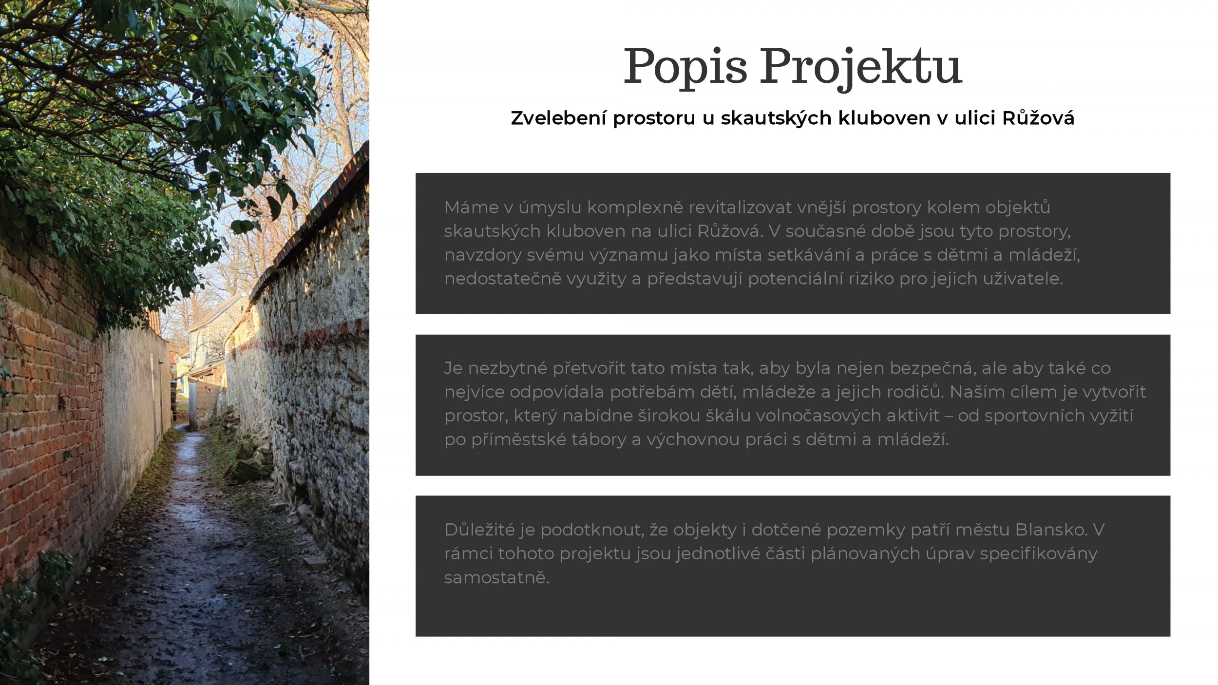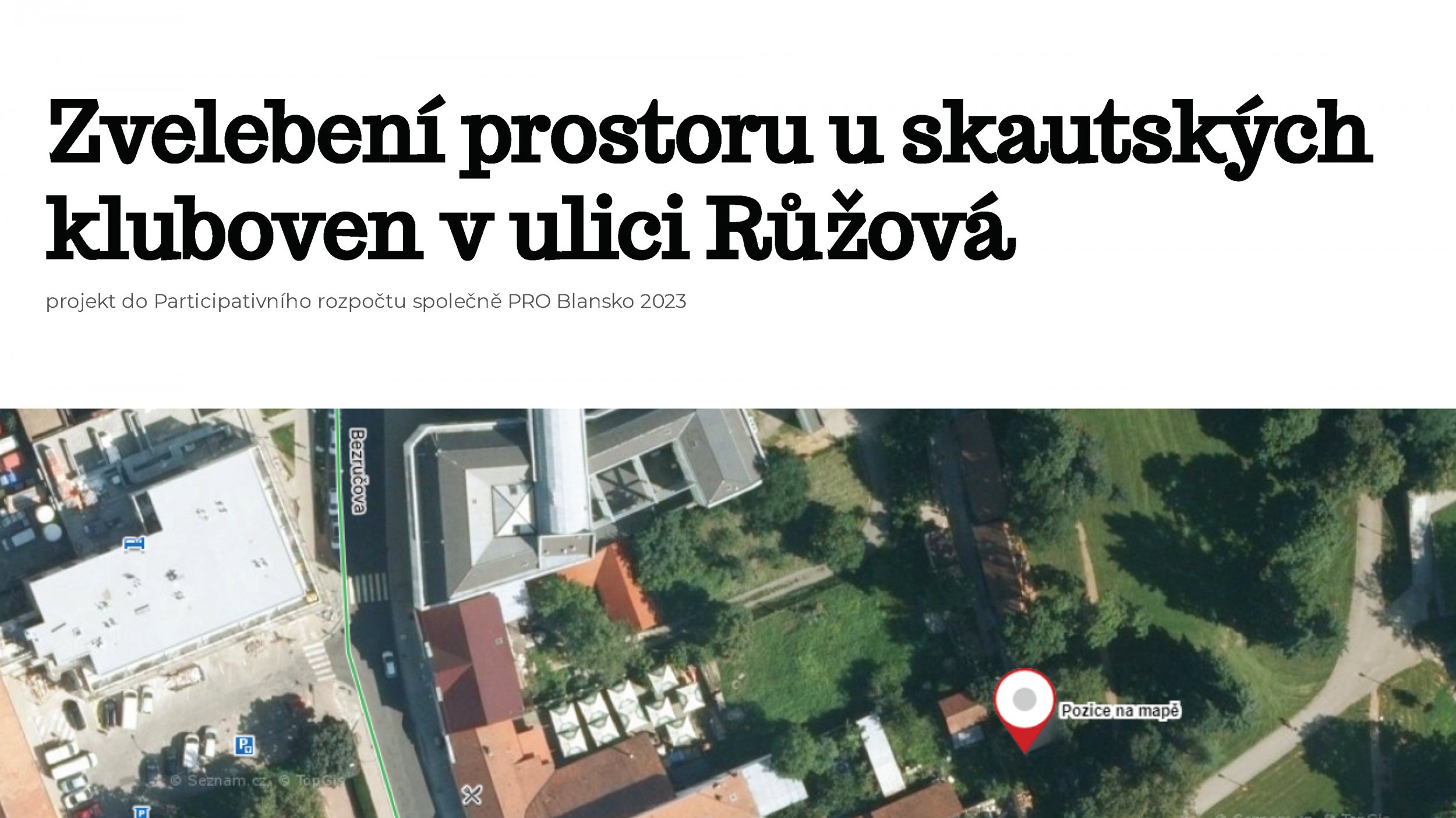 Máme v úmyslu komplexně revitalizovat vnější prostory kolem objektů skautských kluboven na ulici Růžové. V současné době jsou tyto prostory, navzdory svému významu jako místa setkávání a práce s dětmi a mládeží, nedostatečně využity a představují potenciální riziko pro jejich uživatele. Je nezbytné přetvořit tato místa tak, aby byla nejen bezpečná, ale aby také co nejvíce odpovídala potřebám dětí, mládeže a jejich rodičů.