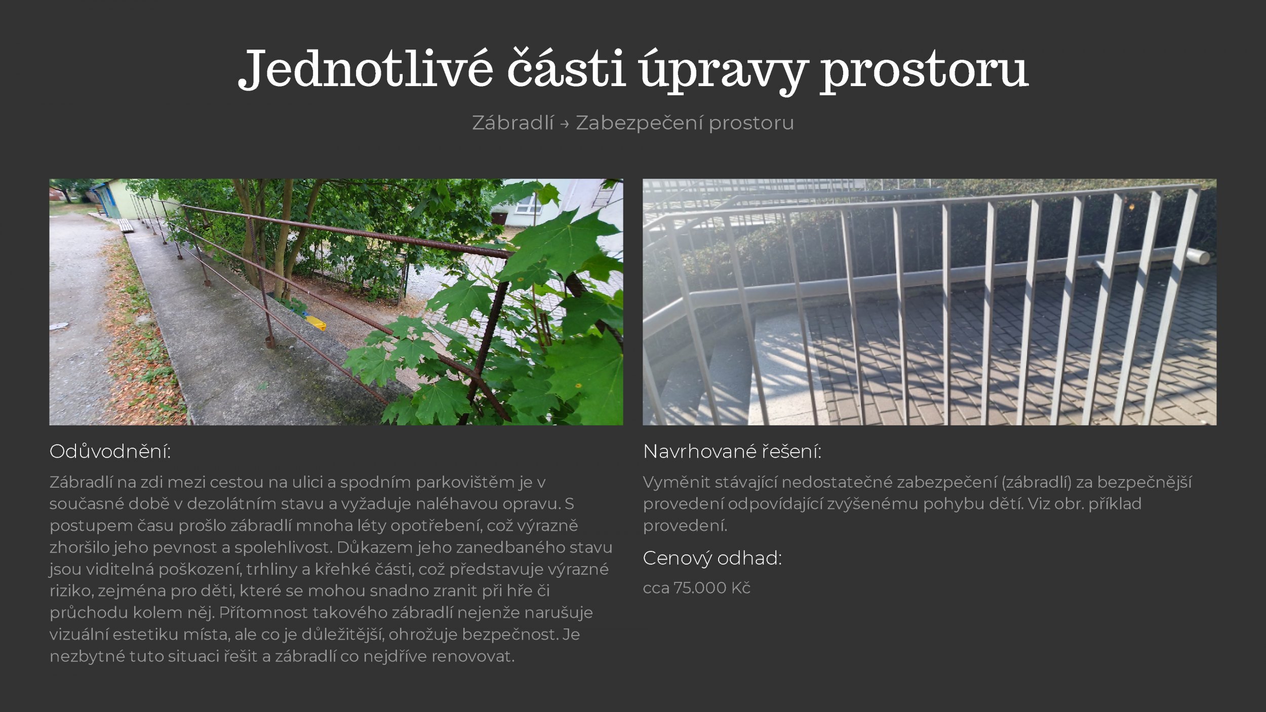 Odůvodnění: Zábradlí na zdi mezi cestou na ulici a spodním parkovištěm je v současné době v dezolátním stavu a vyžaduje naléhavou opravu. S postupem času prošlo zábradlí mnoha léty opotřebení, což výrazně zhoršilo jeho pevnost a spolehlivost. Důkazem jeho zanedbaného stavu jsou viditelná poškození, trhliny a křehké části, což představuje výrazné riziko, zejména pro děti, které se mohou snadno zranit při hře či průchodu kolem něj. Přítomnost takového zábradlí nejenže narušuje vizuální estetiku místa, ale co je důležitější, ohrožuje bezpečnost. Je nezbytné tuto situaci řešit a zábradlí co nejdříve renovovat.