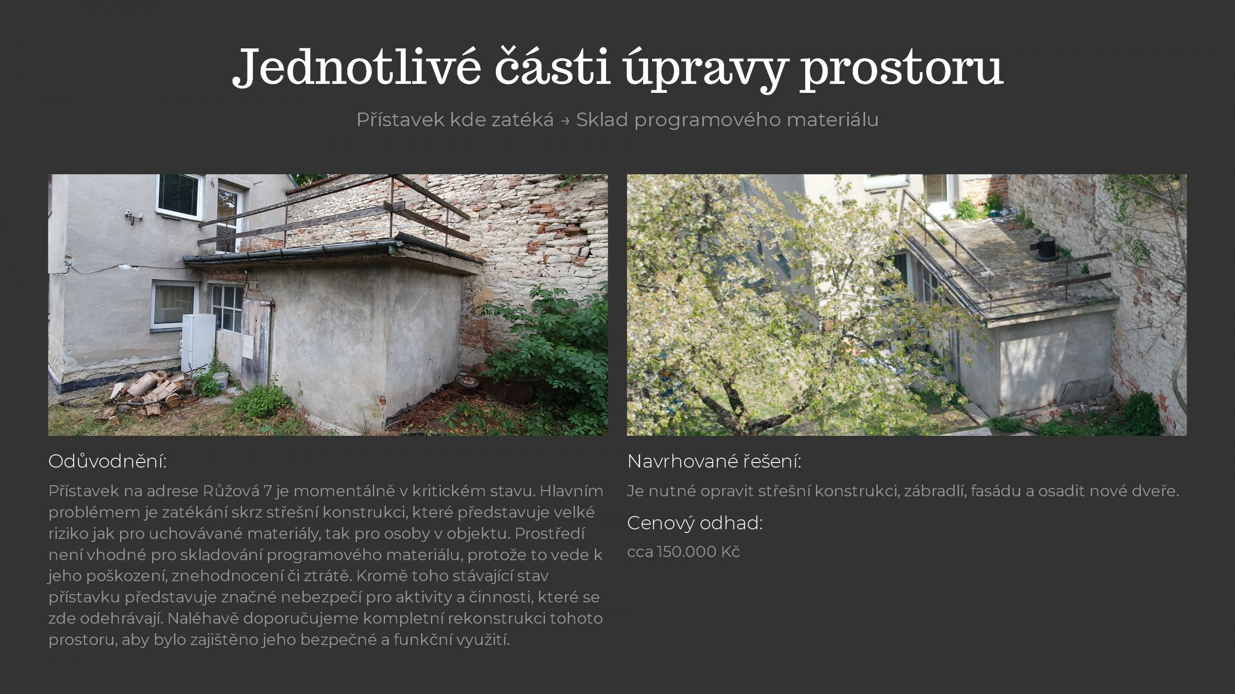 Odůvodnění: Přístavek na adrese Růžová 7 je momentálně v kritickém stavu. Hlavním problémem je zatékání skrz střešní konstrukci, které představuje velké riziko jak pro uchovávané materiály, tak pro osoby v objektu. Prostředí není vhodné pro skladování programového materiálu, protože to vede k jeho poškození, znehodnocení či ztrátě. Kromě toho stávající stav přístavku představuje značné nebezpečí pro aktivity a činnosti, které se zde odehrávají. Naléhavě doporučujeme kompletní rekonstrukci tohoto prostoru, aby bylo zajištěno jeho bezpečné a funkční využití.