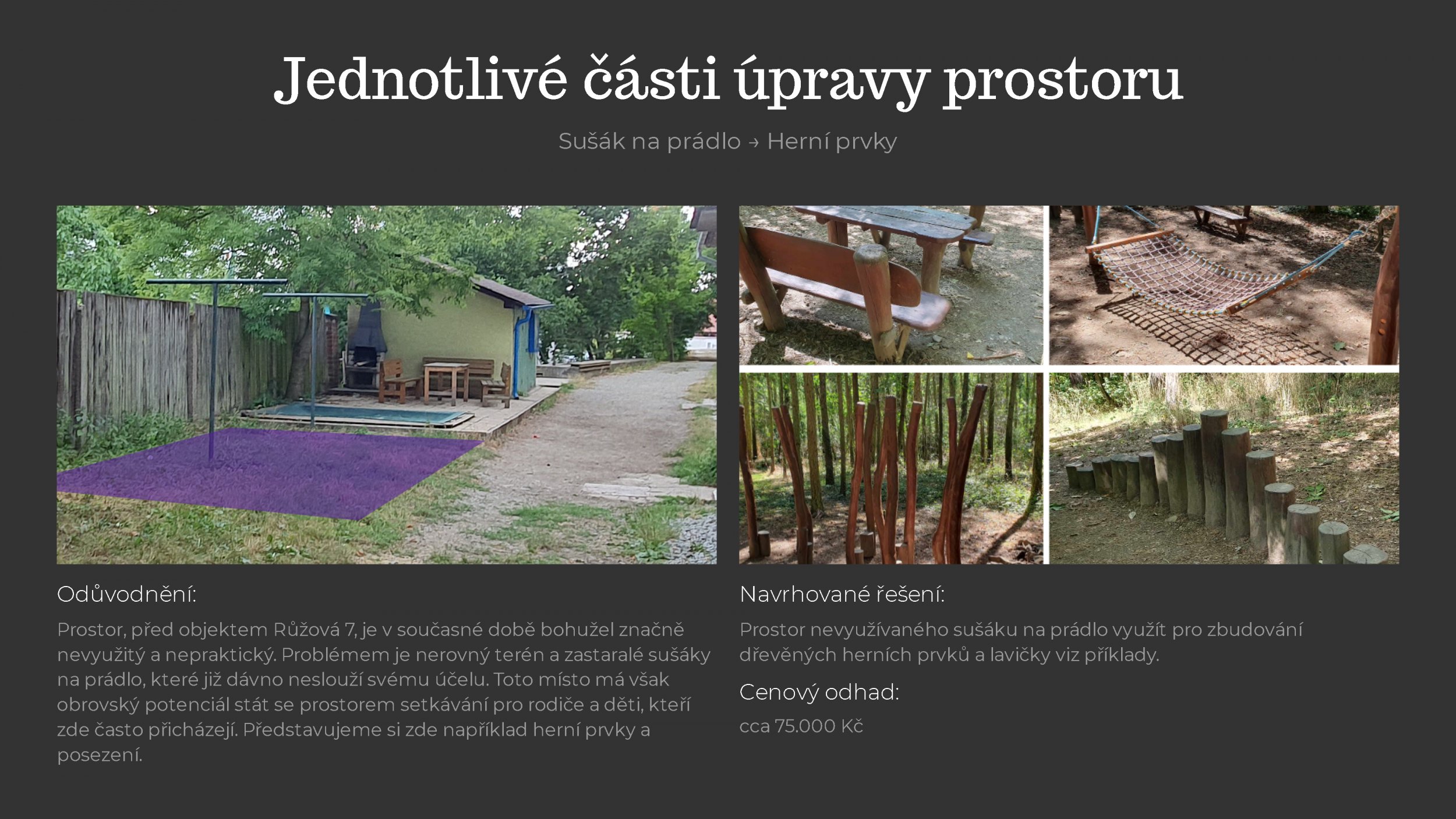 Odůvodnění: Prostor, před objektem Růžová 7, je v současné době bohužel značně nevyužitý a nepraktický. Problémem je nerovný terén a zastaralé sušáky na prádlo, které již dávno neslouží svému účelu. Toto místo má však obrovský potenciál stát se prostorem setkávání pro rodiče a děti, kteří zde často přicházejí. Představujeme si zde například herní prvky a posezení.