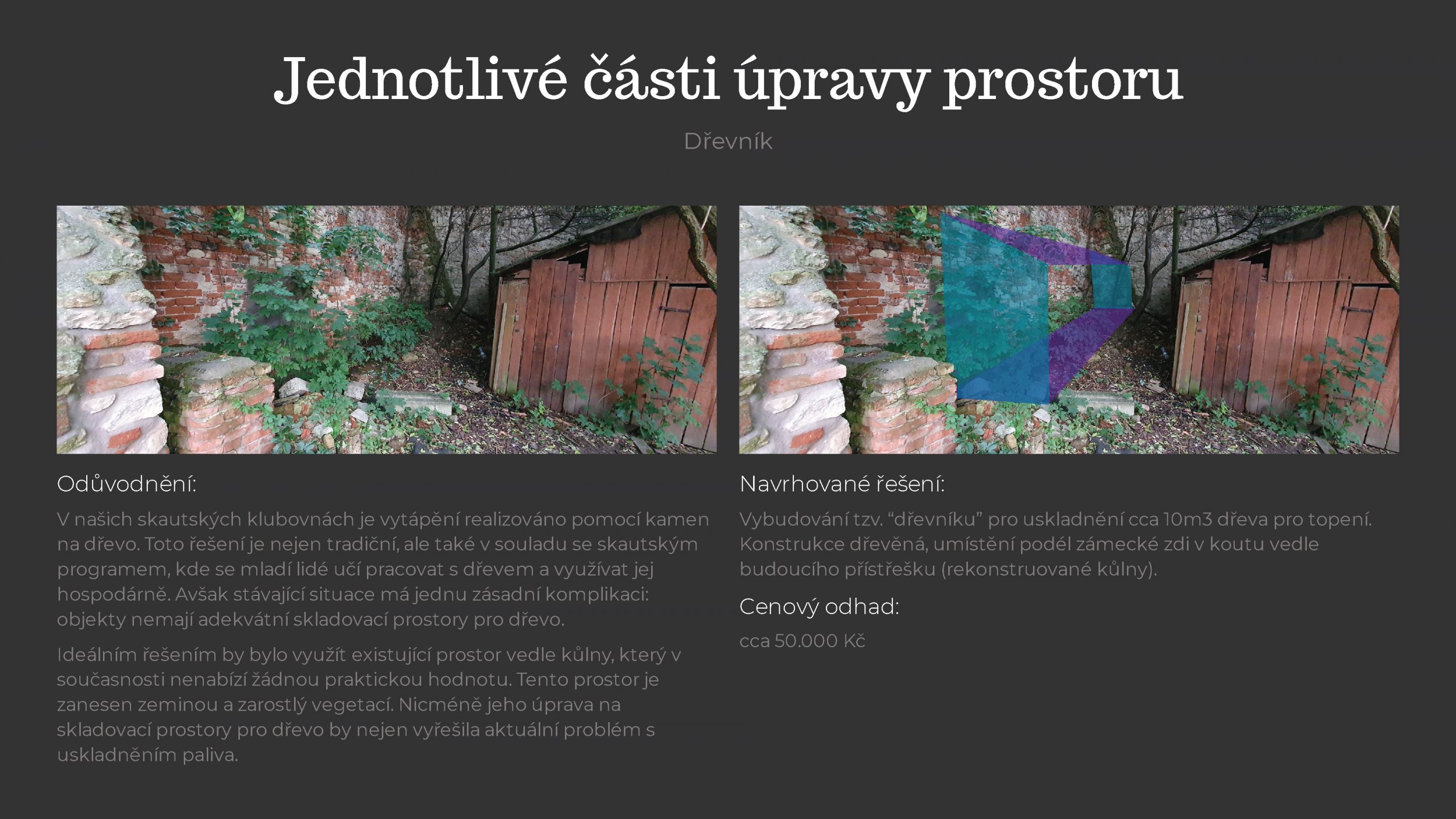 Odůvodnění: V našich skautských klubovnách je vytápění realizováno pomocí kamen na dřevo. Toto řešení je nejen tradiční, ale také v souladu se skautským programem, kde se mladí lidé učí pracovat s dřevem a využívat jej hospodárně. Avšak stávající situace má jednu zásadní komplikaci: objekty nemají adekvátní skladovací prostory pro dřevo. Ideálním řešením by bylo využít existující prostor vedle kůlny, který v současnosti nenabízí žádnou praktickou hodnotu. Tento prostor je zanesen zeminou a zarostlý vegetací. Nicméně jeho úprava na skladovací prostory pro dřevo by nejen vyřešila aktuální problém s uskladněním paliva. detaily viz obrazová příloha