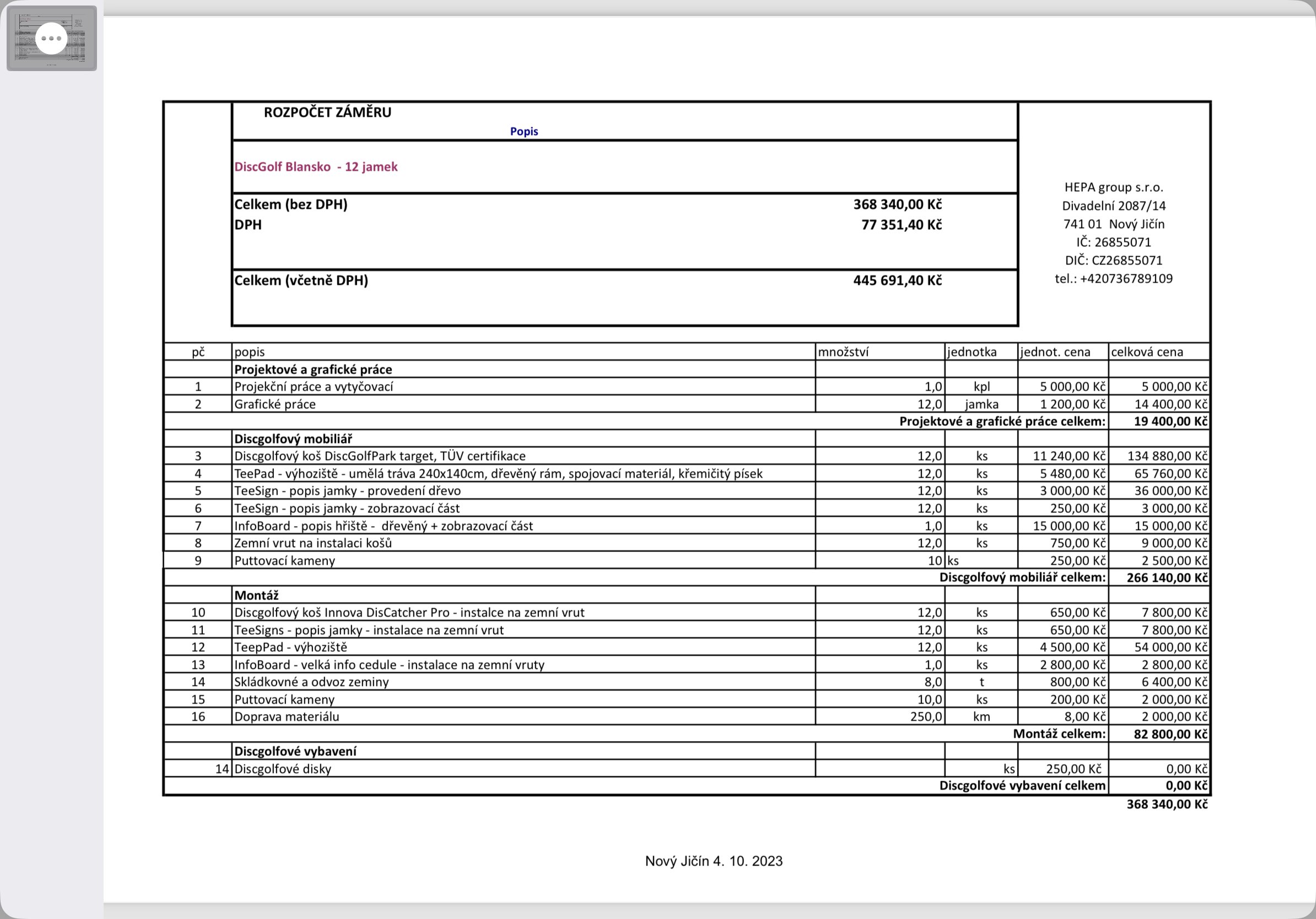 Součástí nákladů jsou kromě vlastní realizace hřiště i projekční a grafické práce včetně konkrétního návrhu umístění jamek a návrhu místních pravidel uvedených na informační tabuli. Odhadovaná cena projektu je 370 tis. Kč bez DPH.
