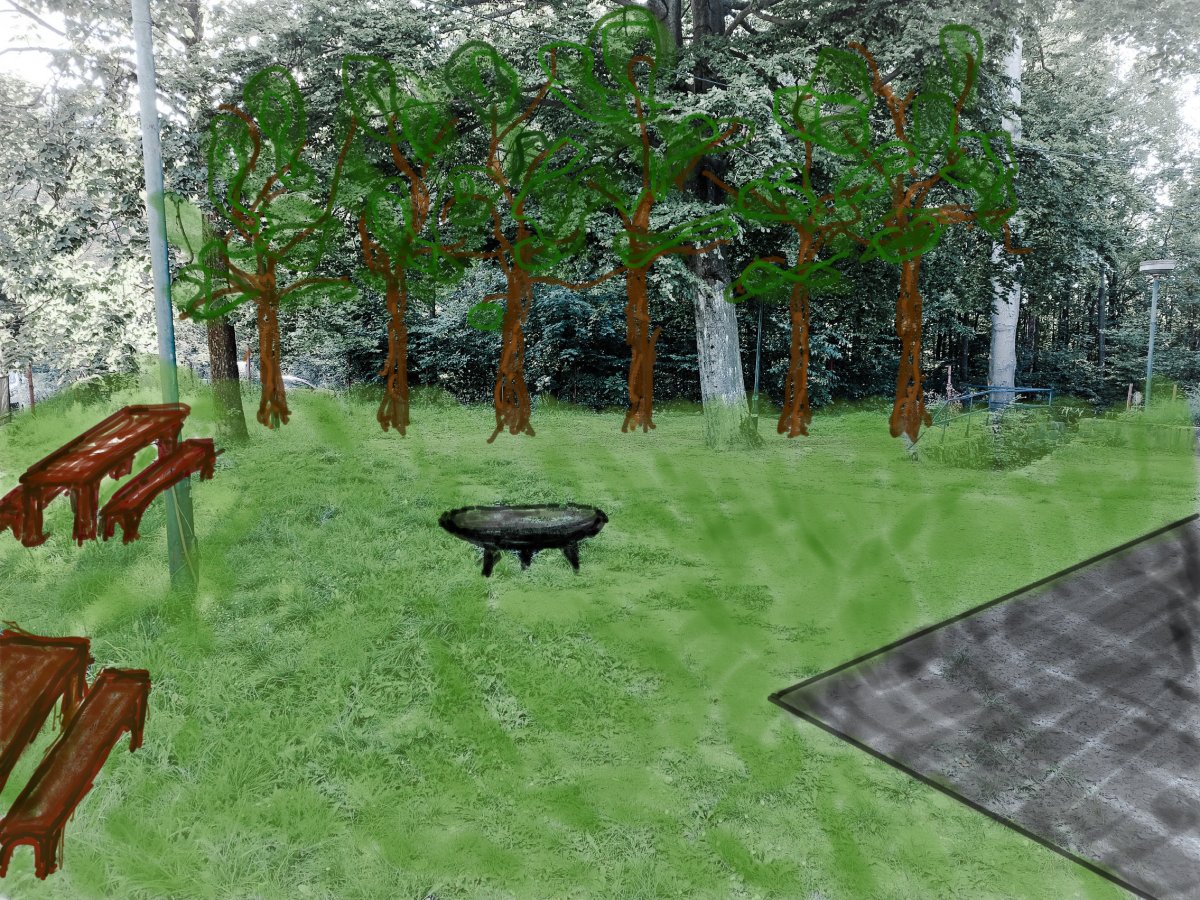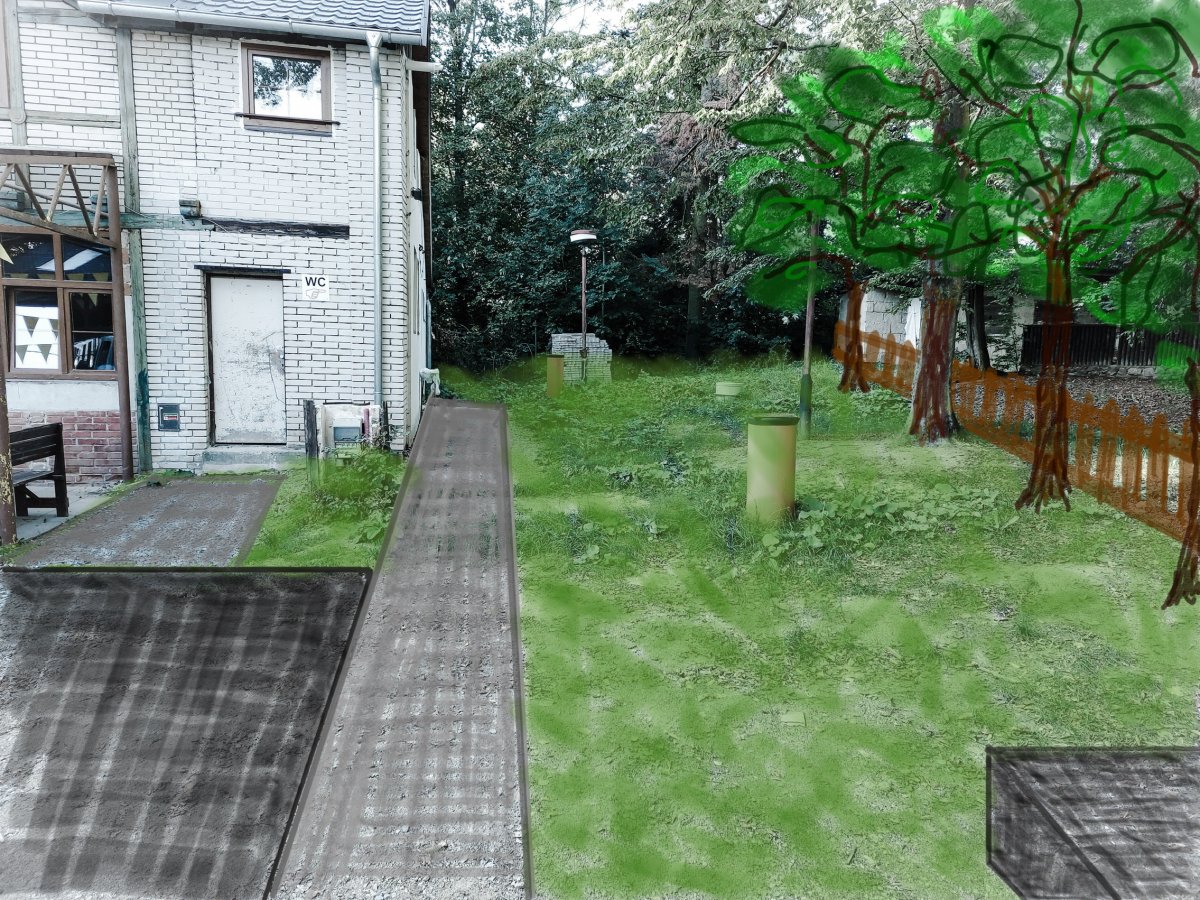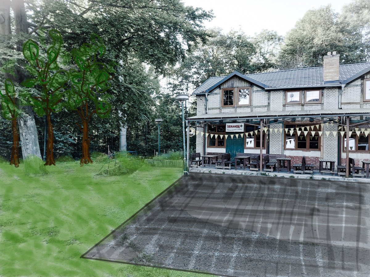Zemní práce Srovnání pozemku do roviny v jeho východní části. V západní části vytvořit ve středu terénní návaznost, kterou dále ponechat v přirozeném svahu. Příprava na výsadbu – 906 m² – 65 tis. Kč, příprava plochy – 250 m² – 98 tis. Kč, srovnání pozemku do roviny – 113 m² – 100 tis. Kč. Zpevněné plochy Vytvořit zpevněnou plochu před objektem Verandy. Příprava zpevněné plochy – 200 m², vydláždění plochy – 184 m². Celkem 220 tis. Kč Výsadba Na většinu pozemku a mimo zpevněných ploch založit trávník. Po obvodu pozemku vysadit listnaté stromy jako náhradu za dožívající vzrostlé buky. Výsadba trávník – 770 m² – 35 tis. Kč, výsadba stromy – 9.5 tis. Kč. Výstavba Vybudovat jednoduchý plot z pletiva na východní straně pozemku. Realizace plotu, cca 36 m – 58 tis. Kč Doplňky Po obvodu jižní části pozemku vytvořit stacionární posezení (stoly a lavice). V západní části vybudovat prostor pro ohniště. Instalovat doplňkové prvky (odpadkové koše, zahradní doplňky). Pořízení a instalace 18 ks lavic – 50 tis. Kč, 9 ks stolů – 55 tis. Kč, 1 ks ohniště – 9 tis. Kč. Rozpočet Předpokládaná cena je do 700 tis. Kč. Pro realizaci není třeba stavebního povolení, ani ohlášení stavby. Zpevněné plochy, které by pro to mohly být toho předmětem, jsou do 200 m². Tato skutečnost byla ověřena na stavebním úřadu. Návrh je v souladu se stávající projektovou dokumentací na rekonstrukci objektu Veranda.