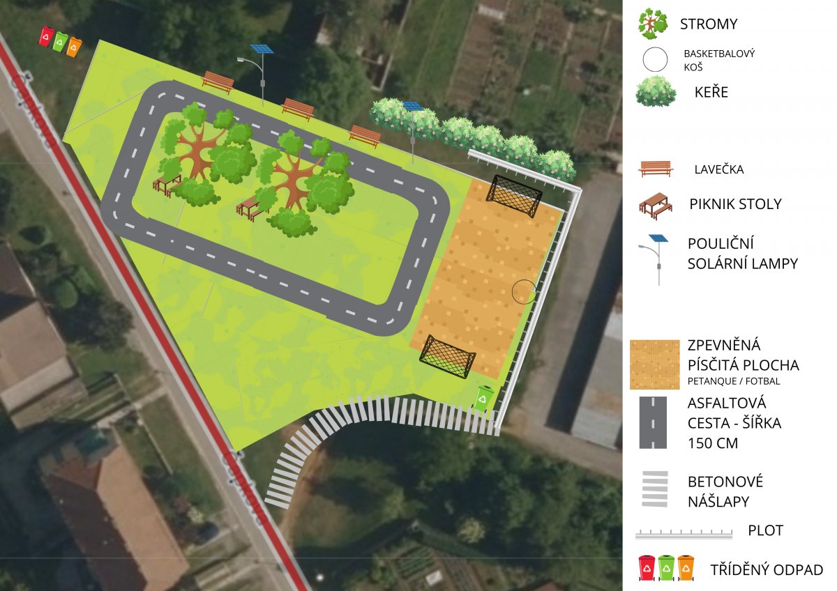 • Cíl projektu: Navrhované řešení zahrnuje vytvoření parku s asfaltovou cestou ve tvaru oválu pro děti na koloběžkách a kolech, piknikovou zónu se stoly a lavičkami, fotbalový plácek s pískovým povrchem, brankami a basketbalovým košem. Déle také úpravu vyšlapané cesty tak, aby tato úprava zachovala možnost sáňkování (bez obrubníků), které musí být zachováno, což také umožní plné sezónní využití prostoru. Dále budou vysázeny stromy a keře, které zajistí přírodní stín. K udržení čistoty budou umístěny odpadkové koše na tříděný odpad. Solární lampy využijí plného slunce k energeticky samostatnému a udržitelnému provozu. • Komu je projekt určen: Projekt je zaměřen na rodiny s dětmi, mládež, dospělé i seniory z přilehlých oblastí. Odhaduje se, že revitalizovaný prostor využije několik desítek rodin, které by jinak neměly v okolí žádné vhodné místo podobného typu k trávení volného času. • Odhadované náklady: Na základě zmapování trhu jsou odhadované náklady na realizaci projektu následující: o Asfaltová cesta (150 cm široká, 60 m dlouhá) – 70 000 Kč o 3 lavičky – 20 000 Kč o 2 piknikové stoly – 45 000 Kč o Výsadba stromů (2 ks) – 50 000 Kč – javor červený o Výsadba keřů (6 ks) – 8 000 Kč o Sportovní plocha (pískový povrch + 2 branky + basketbalový koš) – 50 000 Kč o 2 stojící solární lampy – 70 000 Kč o Instalace plotu (30m délka/5m výška) – 30 000 Kč o Koše na tříděný odpad – 5 000 Kč o Zatravnění a terénní úpravy (1000 m²) – 200 000 Kč o Úprava vyšlapané cesty – 20 000 Kč o Práce (20 % celkových nákladů) – 113 600 Kč Celkové odhadované náklady na projekt: 681 600 Kč.