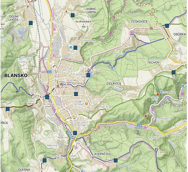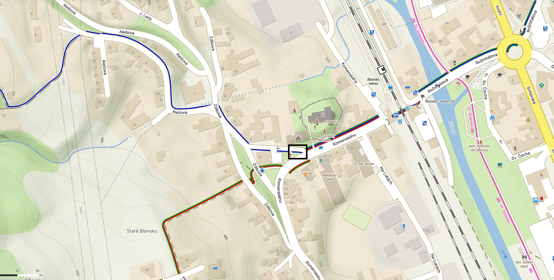 5) Staré Blansko – u kostela, na rozcestí modré a červené/zelené turistické značky