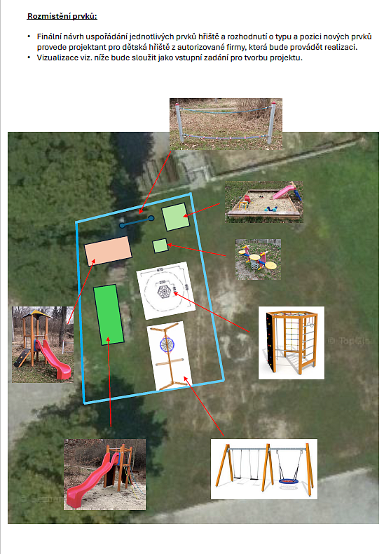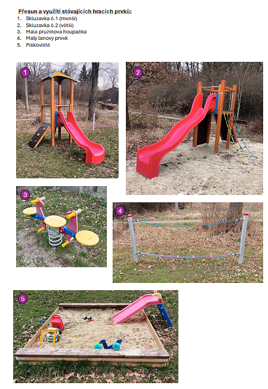 Návrh řešení: – Přírodní povrch a zapracování do okolní zeleně zlepší mikroklima na herní ploše. – Lavičky a odpočinkové zóny pro rodiče a doprovod posílí sousedské vztahy při setkávání v areálu a umožní žádoucí dohled nad dětmi. – Použití trvanlivých materiálů herních prvků a úprava blízkého okolí zvýší celkovou estetiku areálu. – Počítáme i s využitím několika herních prvků, které jsou instalovány v prostoru nyní a jejichž technický stav umožní jejich další používání. – Návrh řešení tak, aby bylo počítáno s další postupnou modernizací a rozvojem hřiště.